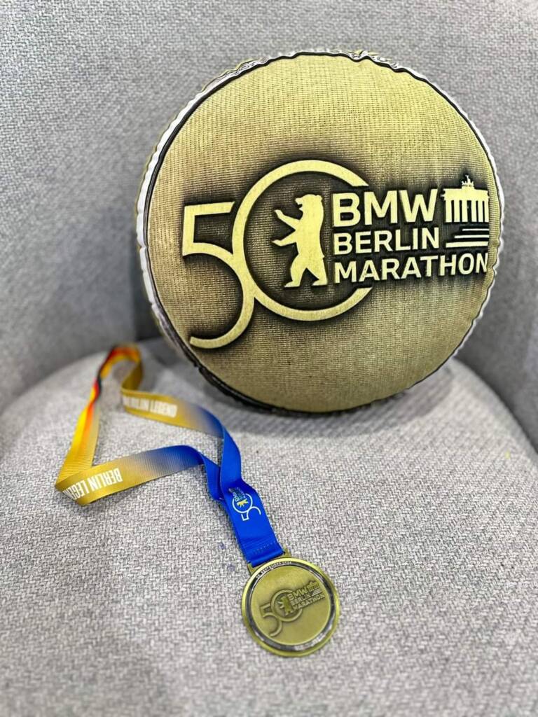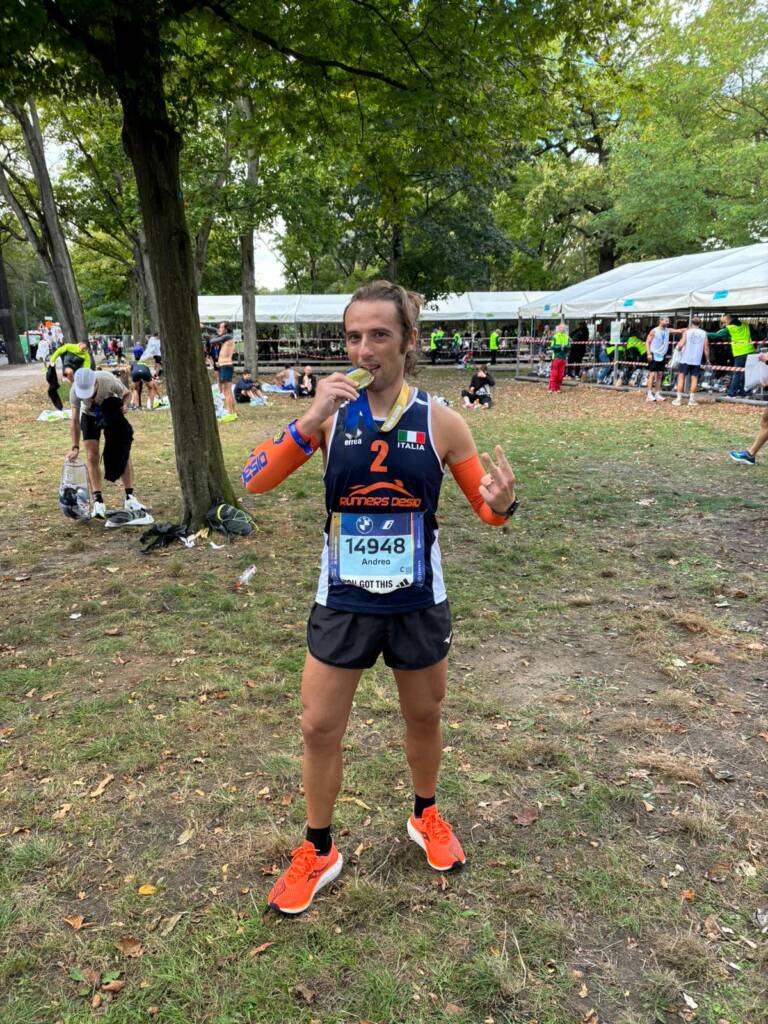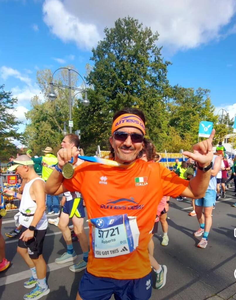 Marco ha “sguazzato” nel lusso dell’organizzazione riuscendo a portare a casa la medaglia dopo un gran periodo di preparazione. L’ultima sua maratona risale al 2015, periodo di gran forma per lui, in quell’anno partecipò a quattro maratone, in quella di Verona stabilì il suo attuale PB 03:27:33. A Berlino sfora di poco il suo obbiettivo,chiudendo in 4:34:36.