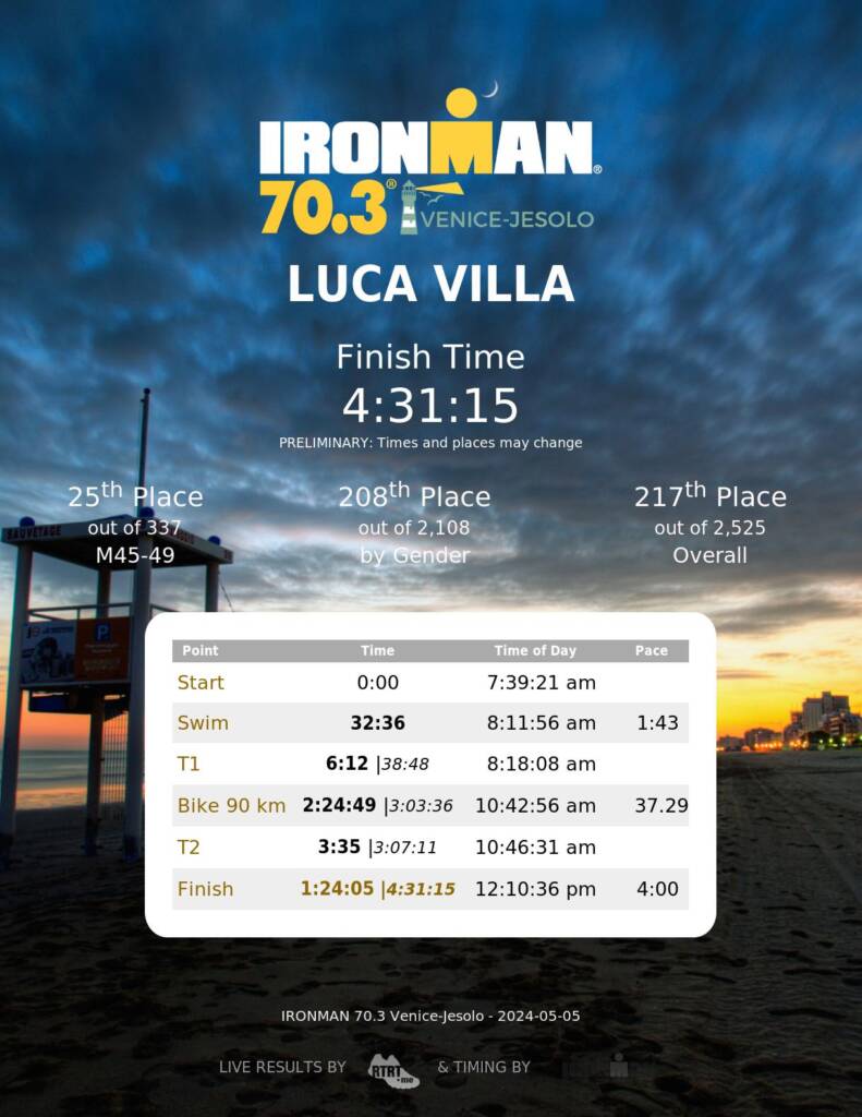 La scorsa settimana l’imponente risultato di Laura Birolini nella 48 ore del Running Festival è al momento anche la migliore prestazione europea dell’anno nella sua categoria (SF60), questo per enfatizzare anche l’orgoglio da parte della nostra società nell’avere campioni di un certo spessore. Cogliamo l’occasione anche per menzionare Luca Villa, un altro grande tesserato di casa nostra che domenica scorsa si è ancora una volta superato nella specialità dell’Ironman 70.3 o chiamato anche mezzo Ironman. La gara si svolge in successione partendo con il nuoto per 1,9 km, poi 90 km in bicicletta e per concludere una mezza maratona. La definizione di Ironman 70.3 è il risultato dalla somma delle tre distanze in miglia terrestri (1,2 + 56 + 13,1 = 70.3).